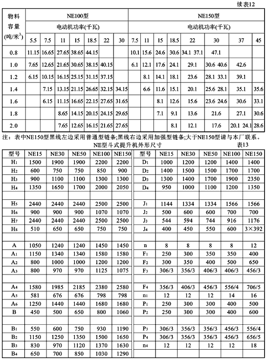 NE型斗式提升機(jī)的規(guī)格性能列入表10;驅(qū)動裝置型號列入表11;不同提升高度所需的驅(qū)動裝置功率列入表12。 驅(qū)動裝置有左裝和右裝兩種,可按用戶要求配置。面對提升機(jī)進(jìn)料口,驅(qū)動裝置在提升機(jī)左側(cè)為左裝;在右側(cè)為右裝。