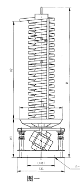 ZC系列垂直振動(dòng)輸送機(jī)的驅(qū)動(dòng)裝置振動(dòng)電機(jī)安裝在輸送塔下部,兩臺(tái)振動(dòng)電機(jī)對(duì)稱交叉安裝,輸送塔由管體和焊接在管體周圍的螺旋輸送槽組成,輸送塔座于減振裝置上,減振裝置由底座和隔振彈簧組成。 (見圖一)